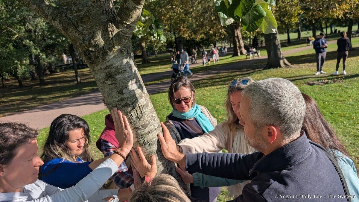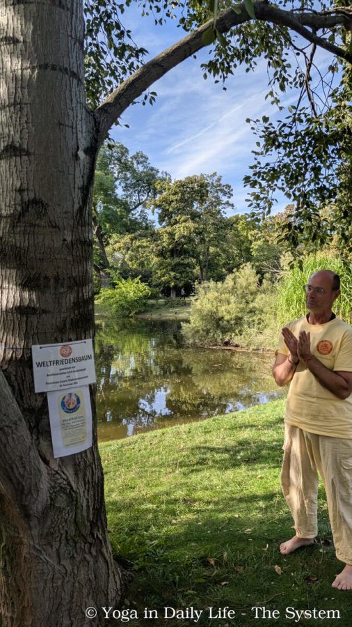 In Queen’s Park, London, Yoga in Daily Life practitioners and devotees gathered to pray for world peace at the Peace Tree, planted by Vishwaguruji and local dignitaries in 2010.