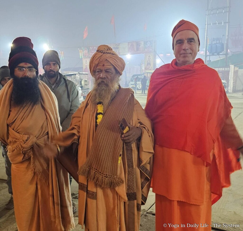 At the sacred Maha Kumbh Mela in Prayagraj, Vishwaguruji, Mahamandaleshwar Paramhans Sri Swami Maheshwarananda Ji, was represented by Mahamandaleshwar Swami Gyaneshwar Puri Ji, accompanied by sannyasis and numerous international devotees of Yoga in Daily Life.