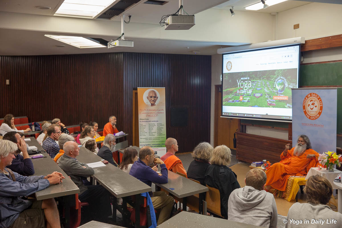 Vishwaguruji gave theoretical and practical lectures and satsangs about how to manage everyday stress through using simple yogic techniques. In particular, Vishwaguruji explained the Brahmari Pranayama technique and OM chanting, and suggested to practice these on a daily basis, not just for stress management, but to prevent certain health problems.