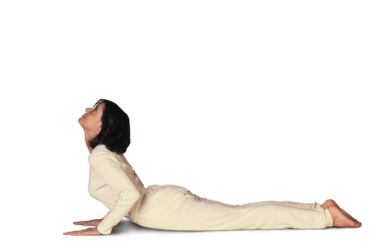 Spusťte pánev dolů a za pomoci paží co nejvíce zvedněte hlavu a trup. Pánev leží na podložce, pohled směřuje vzhůru. Dbejte na to, aby páteř byla rovnoměrně prohnutá.
